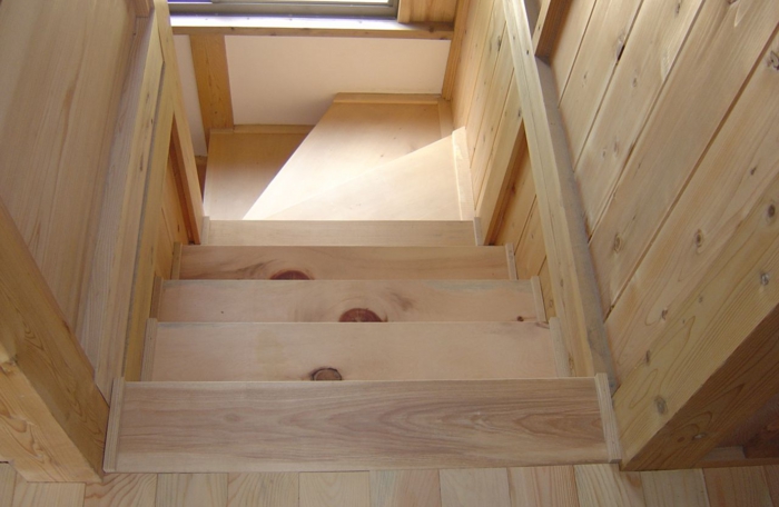 父が1人で施工。階段はセルフビルドのなかで難関の一つです。ささら桁階段で作りました。踏み板は赤松とイチョウを用いました(厚み1寸5分)。