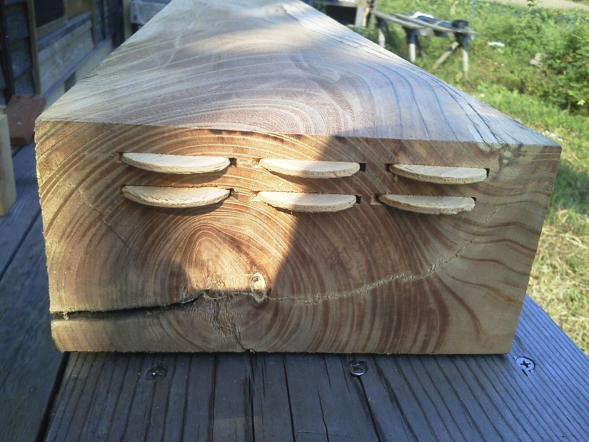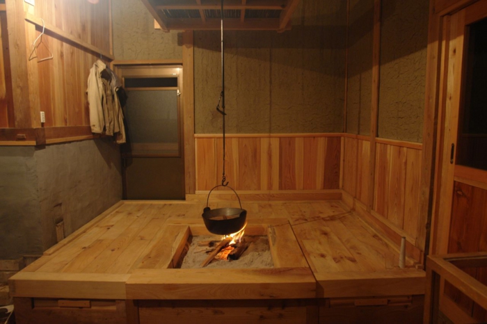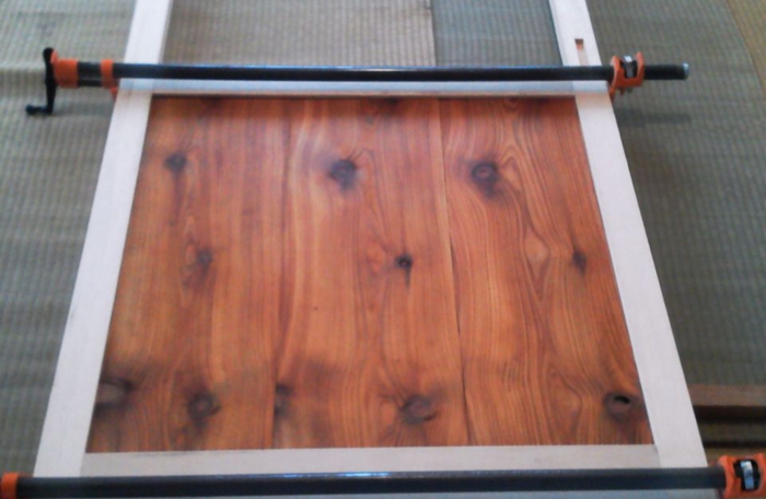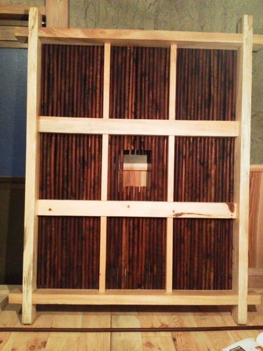 框にケヤキを用いました。厚みが3寸5分もある材料だったので、加工が大変でした。これだけの材料になると完全に近い直方体が私の技術ではできなかったので、ほぞ加工はあきらめ、あまり良くないかもしれませんが、ビスケットで継ぎました。フローリング材は赤松の1寸もある厚板を使用。煙が抜けない問題も発生しましたが、なんとか解決。