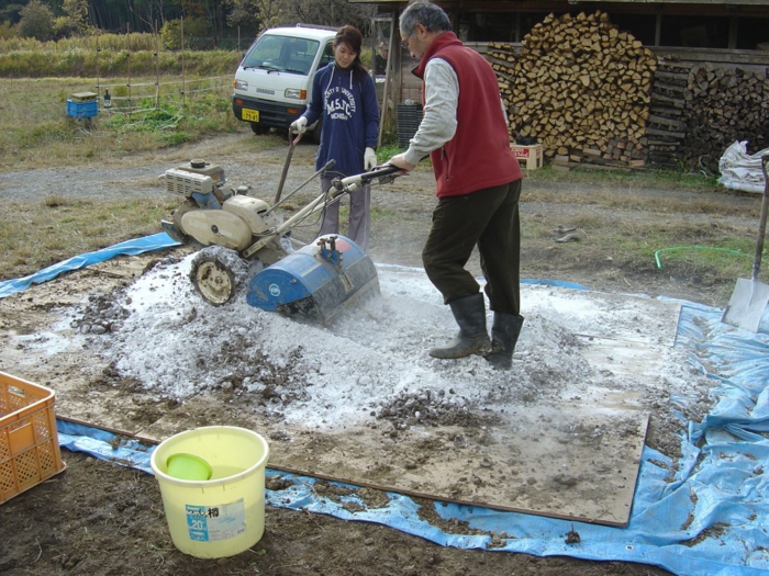 昔ながらのたたき土間を作りました。材料に粘土、消石灰、塩化カルシウム、にがりを使用。材料を混合するのが大変でした。混合したものを叩いていきます。15㎝盛ったものが叩いて10㎝になります。