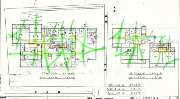 今日主流となっている、高気密高断熱ではなく、通気通風のよい住まい。人間には新鮮な空気の循環が必須なのです。通風の良い住まいでは、エアコンも不要。下の設計図は設計段階で風の通りを十字に通るように考えていることを示しています。