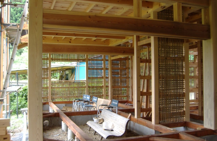 研修生やウーファーが寝泊まりできるように建築。研修棟は基礎から自分たちで施工。構造材はプレカットで刻んでもらいました。建て方は仲間の力をお借りし、ユニックを借りて、一日で何とか行いました。屋根は波板トタンを自分たちで葺きました。壁は竹小舞下地の土壁。刻みのプレカット以外はセルフビルドです。
