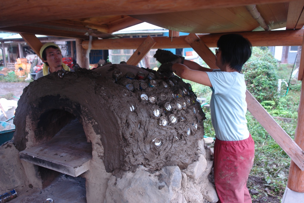 空き缶と空き缶の間はいつものように稲ワラ入りの粘土を塗っていきました。