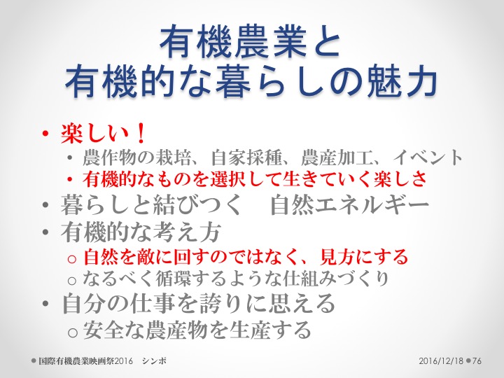 2016年12月18日(日) 武蔵大学(東京)で行われた国際有機農業映画祭の第10回記念シンポジウムにパネリストとして参加させていただきました。