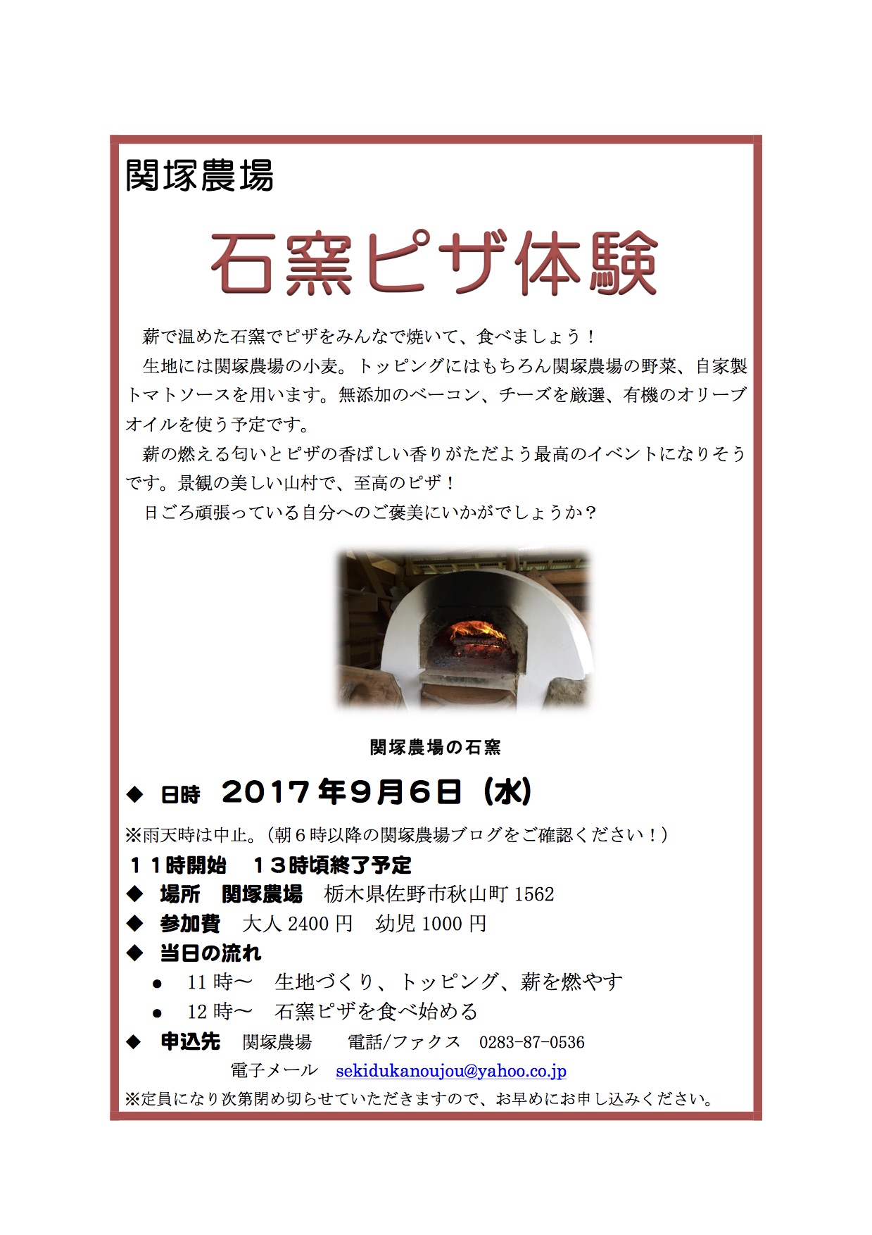 石窯ピザ体験 参加者募集! 2017年9月6日(水)薪窯ピザはいかが?